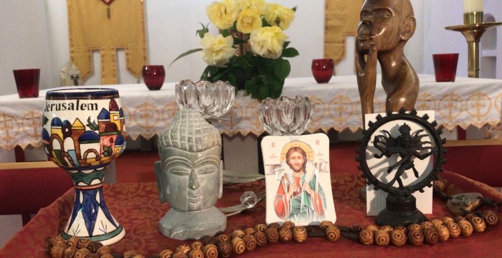 En la instantánea, junto al altar de la Iglesia de los Mártires Católicos Ingleses, parroquia de Hornchurch, se observa la preparación que están llevando a cabo para celebrar este día de oración. Un Buda, el ‘tasbih’ musulmán, la diosa Shiva y lo que parece ser un ídolo de alguna religión animista africana. Entre estos ídolos, podemos encontrar, como uno más, a Nuestro Señor Jesucristo, bajo la imagen del Buen Pastor.
